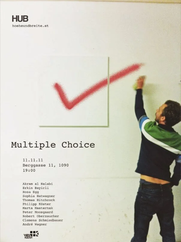 “Multiple choice” 1+2 Exhibition : 11.11.11. Vienna, Austria. Akram Al Halabi, Erkin Bayirli, Rose Egg, Sophia Hatwagner, Thomas Hitchcock, Philipp Köster, Marta Masternak, Peter Moosgaard, Robert Oberzaucher, Clemens Schmiedbauer, Andre Wagner.
